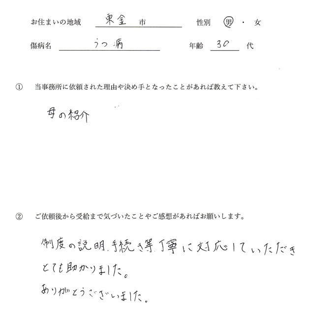 お母様から老齢年金のご相談を頂いた際、息子さんの障害年金の手続きを依頼されました。医療系の国家資格者として就職されましたが、パワハラによりうつ病を発症したことで労災認定され、その後障害者雇用にて再就職されましたが、休職中で翌週には復帰される段階でのご依頼でした。復帰後の状況を把握するため診断書の受取は病院で待ち合わせをし、その場で診断書を確認し訂正を医師にお願いしましたので、その日のうちに申請手続きを終えました。診断書の内容は認定日で2級、現症で3級という感じでしたが、障害者手帳が最初からずっと3級で、障害者雇用とはいえ収入もかなり高く、依頼を受けたときには一人暮らしをしていたこともあり、障害年金の審査は日常生活で判断するとはいうもののそういった状況がどこまで影響するか不明な中での申請となりました。遡りのある請求であったにも関わらず、特にカルテの開示などの追加書類の提出を求められることもなく、請求から2ヶ月経たない期間で無事に認定日2級、現症3級で支給が決定しました。私が障害年金の申請を行ってきた中で、精神障害での請求がほとんど占めていたといっていいほどかなりの件数を行ってきましたが、今回遡及分だけとはいえ障害者手帳の等級より上位等級に該当したことは私にとっても初めての経験でした。障害年金を受給できたからといって病状が軽くなるわけではないので、今ある仕事を続けられるよう受給できたお金を使って少しでも症状が軽くなる方法を見つけていただけると嬉しいです。
