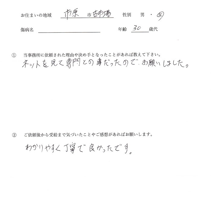 帝王切開による出血多量で意識障害となり、ちょうど初診日から1年半経過後年金事務所にてご相談の上書類などをお持ちの状態で旦那様から依頼を受けました。しっかりと制度を調べられていたこともあり、身体障害者手帳を初診日から半年後に取得されていたことで、認定日の特例により1年前まで遡って年金が支給されました。奥様は現在も施設にてリハビリをしながら生活をされている状態ですので、ただただ早い回復を祈るばかりです。